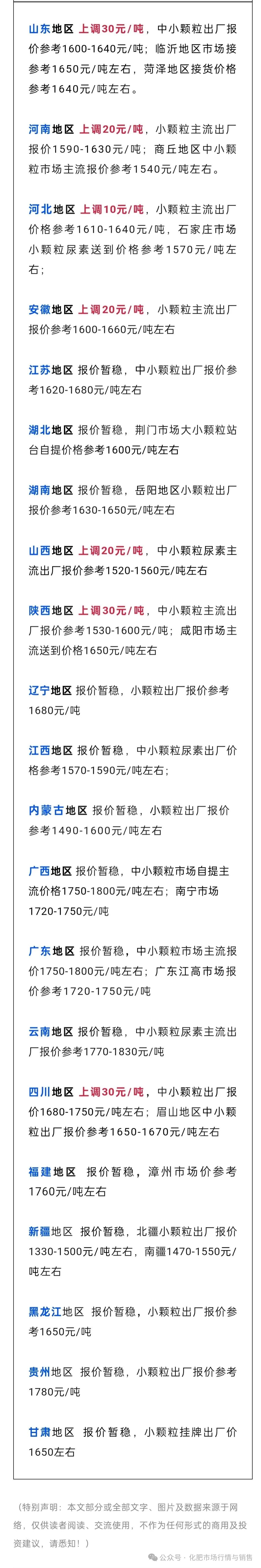 Affected by increasing demand, rising printing prices, and continuous significant increases in urea futures market, domestic urea spot prices have risen widely, with an adjustment range of 10-30 yuan/ton. At present, the daily production of urea remains at around 200000 tons, and there is still supply pressure. The demand side is mainly driven by the essential needs of the compound fertilizer and sheet industry, with limited overall improvement and a strong market wait-and-see sentiment. With the rise of urea futures market, it is expected that urea prices may fluctuate and strengthen in the short term.
